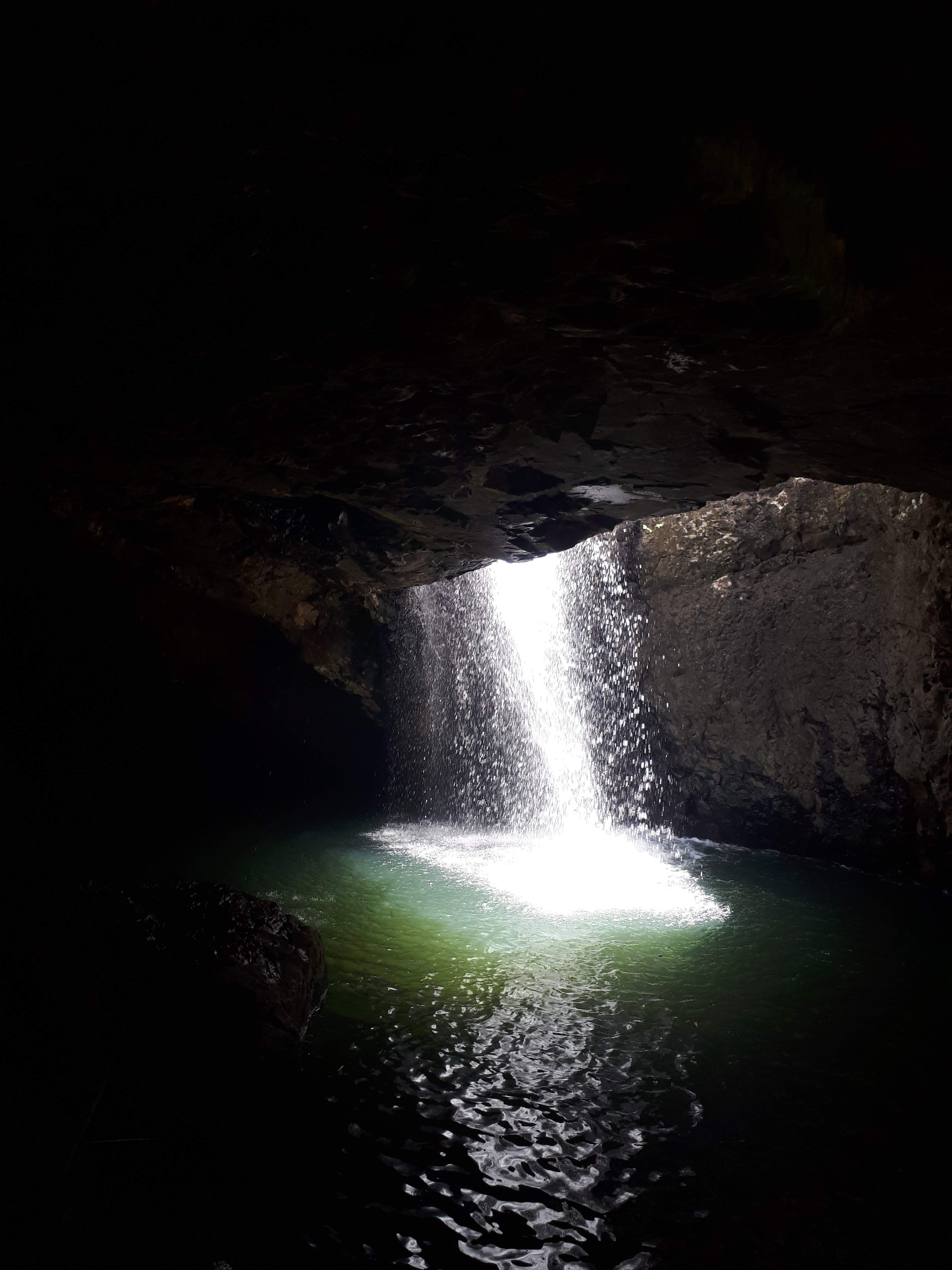 Water fall at the bottom of dark cave