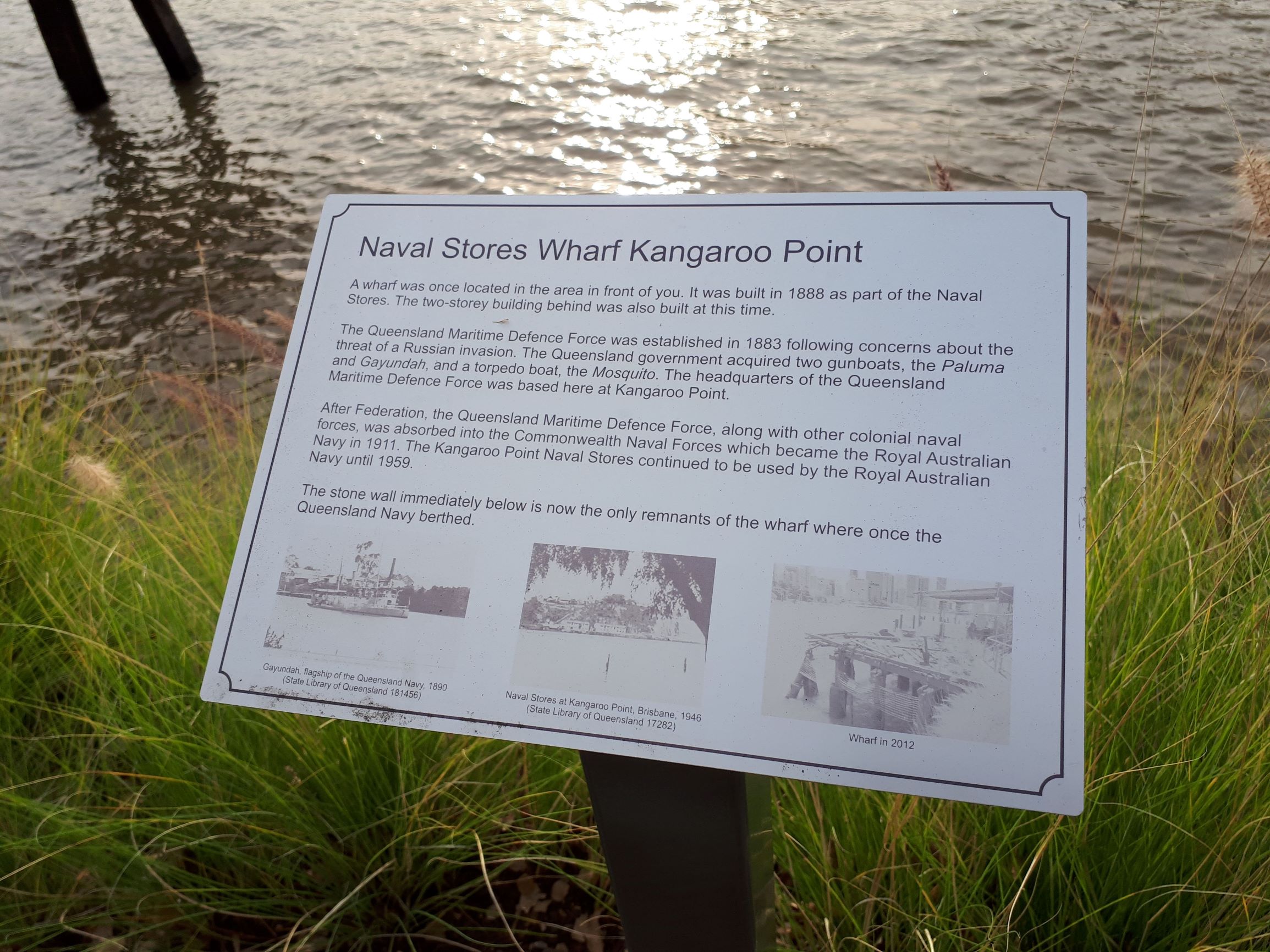 Kangaroo Point is a popular recreation spot, which is a 1.3 km suburb in a peninsula. The headquarters of the Queensland Maritime Defence was based at Kangaroo Point in 1883. After Federation, the Queensland Maritime Defence became part of Royal Australian Navy.